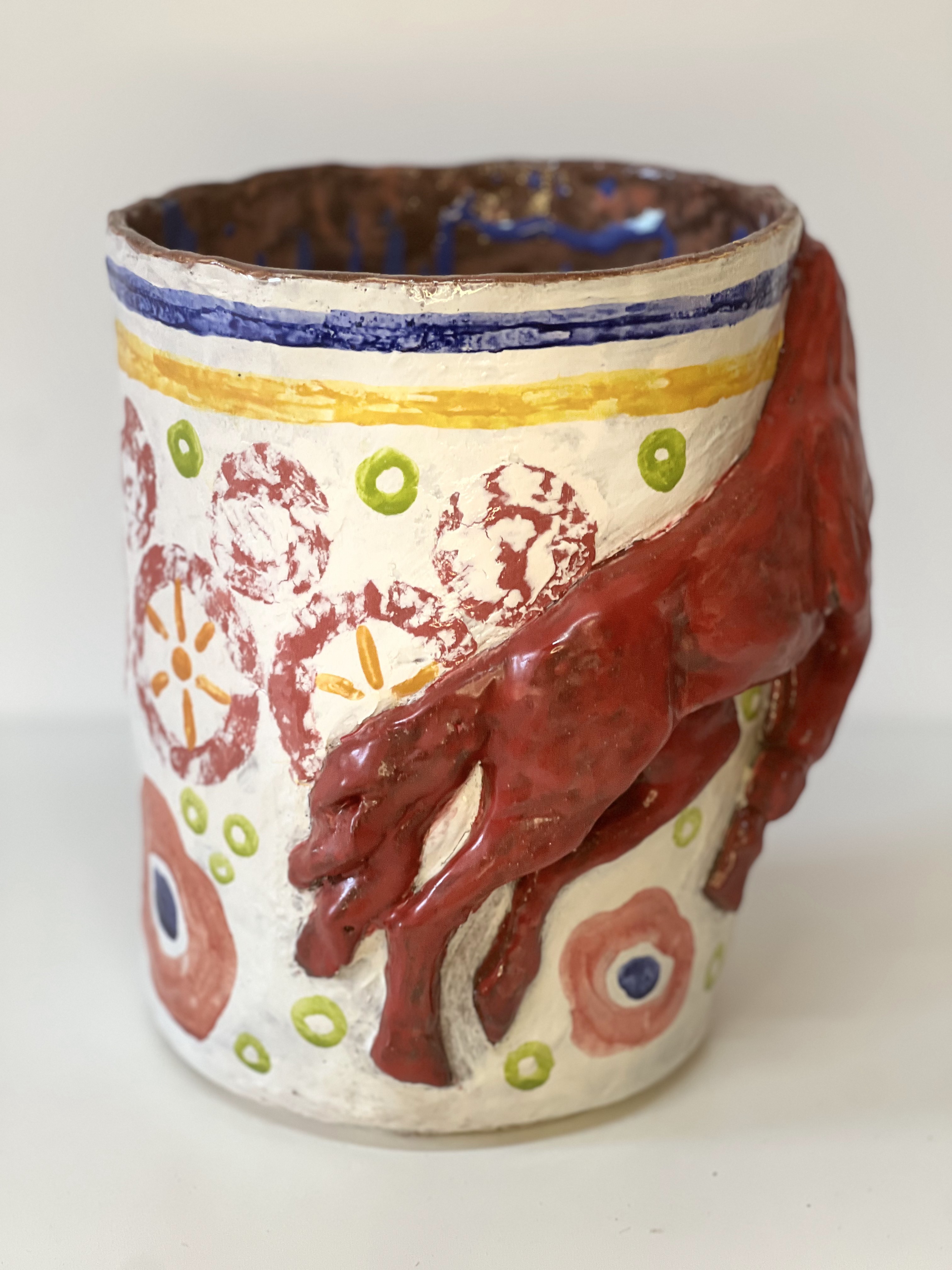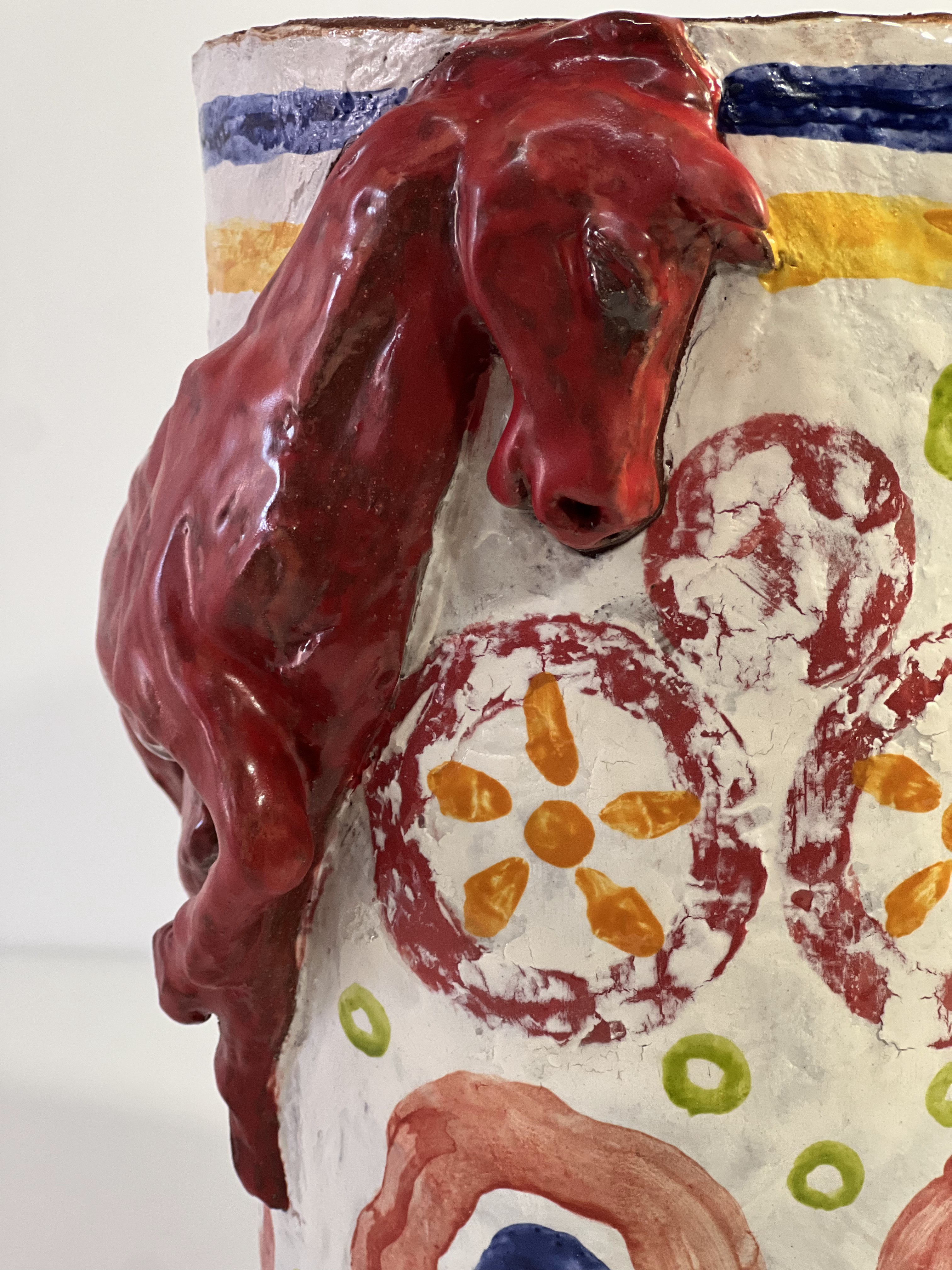 Эта ваза словно вобрала в себя дух грядущего 2026 года, года Красной Огненной Лошади. В её форме, пластике и фактуре чувствуется сила, энергия и внутренняя свобода. Фигура лошади, вылепленная вручную, охватывает сосуд по кругу: её силуэт напоминает движение пламени, живое и неукротимое. Это не просто сосуд, это образ, наполненный стремлением к переменам, волей и красотой. Орнаменты на поверхности напоминают народное декоративное искусство и природные мотивы. Они добавляют работе лёгкости, уравновешивая импульсивную силу образа мягким, игривым декором. Это не просто ваза — это тотем года, насыщенный символикой и визуальной мощью. Как и сама лошадь, она сочетает в себе силу и грацию, неподвластную укрощению.